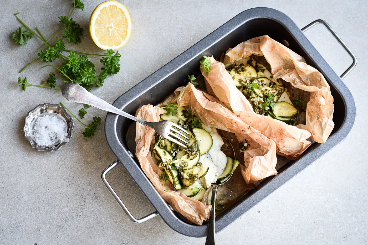 Rødspættepakker i bagepapir med squash og hvidløgssmør