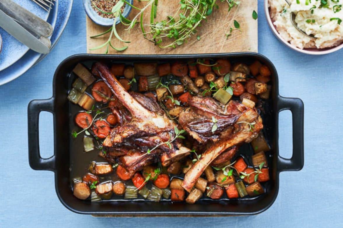 Lammeskank i ovn med rodfrugter og rodfrugtmos er ægte efterårsmad. Du skal lige bruge et par timer, før der er mad på bordet, men det er ventetiden værd, for ud af ovnen kommer der det møreste kød med lækre rodfrugter. Du finder ikke mange retter, der siger efterår som denne.