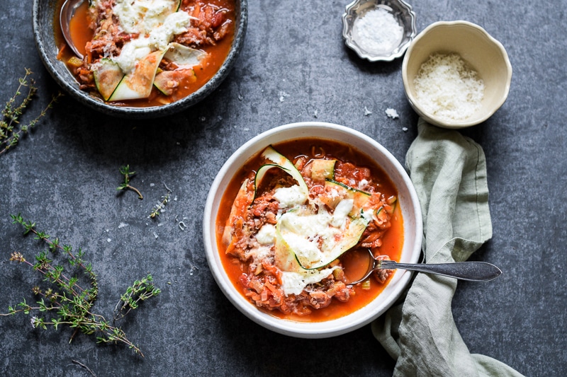 Det er dejligt at spise suppe i den kolde tid og lasagnesuppe er en måde at få den gode smag fra lasagne i en lækker suppe. Vil du hellere lave en mere ‘rigtig’ lasagne, har jeg masser af forslag til det også. Denne lasagne suppe er lavet med inspiration fra min opskrift på lasagne med squashplader men du kan også prøve den mættende og mere fyldige lasagne med proteinplader.