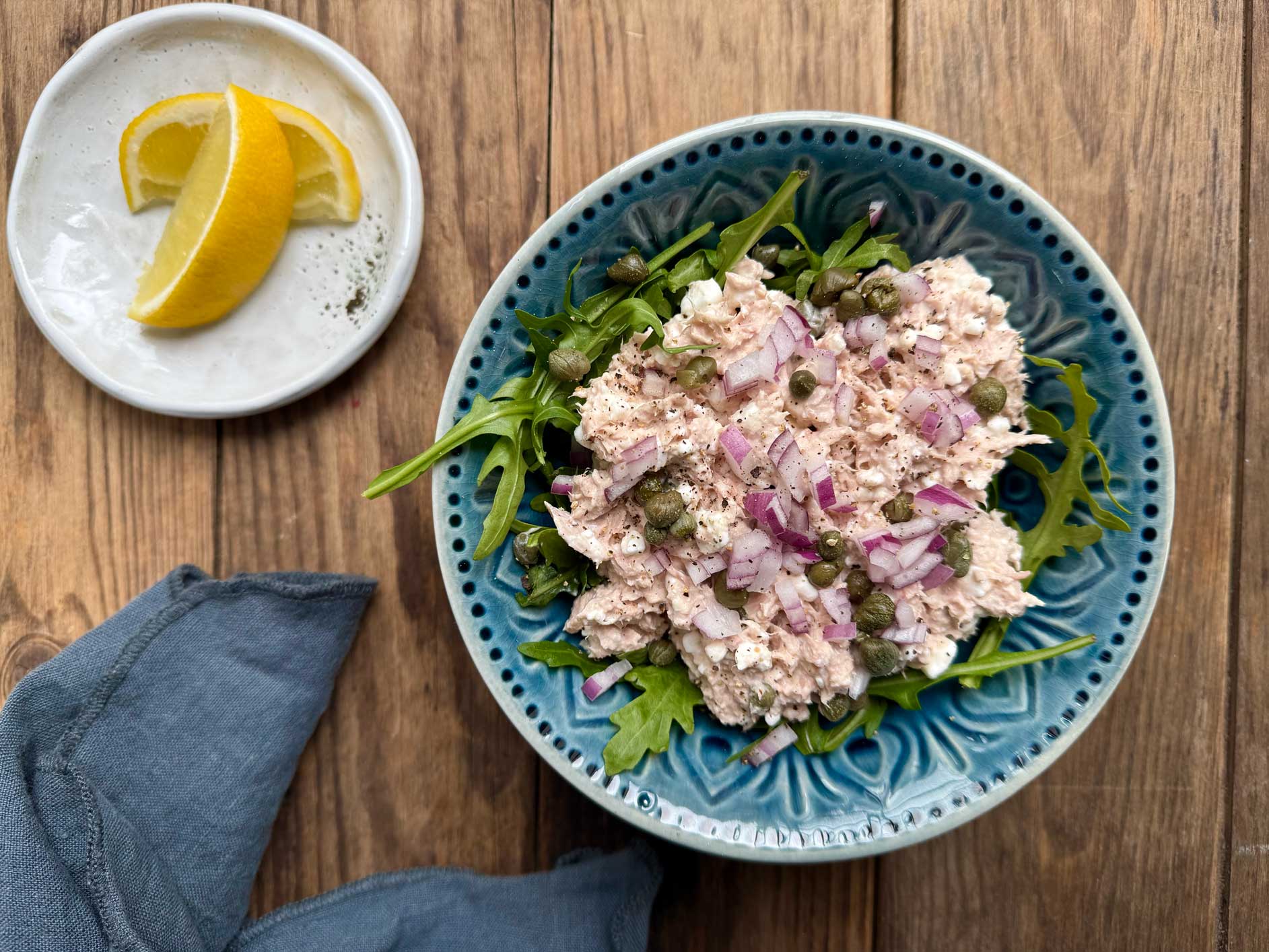 Tunsalat med hytteost er en måde lige at give den gode gamle rørte tun et nøk opad på proteinerne. Opskriften har jeg givet lidt kapers og rødløg, for det smager jo så godt og bliver virkelig lækkert i denne tunsalat.