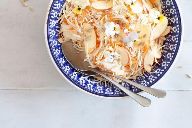 Klassisk råkostsalat med hvidkål og gulerod og med ristede solsikkekerner og lidt æble på toppen er simpelt men lækkert og nemt i hverdagen, hvor tilbehør gerne må være hurtigt lavet. Og nogen gange fungerer det klassiske bare godt, hvidkål, gulerod, æble og lidt citronsaft. Done!