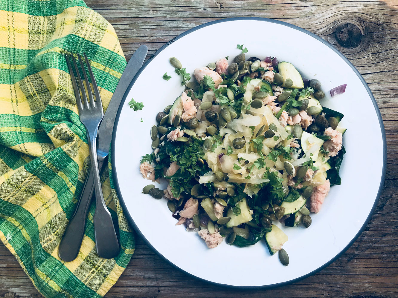 Til sidst kom jeg så til, hvordan jeg kunne øge næringsværdien: Jeg smed et par skefulde kraut på, 1 spsk kapers, lidt græskarkerner og lidt frisk persille.