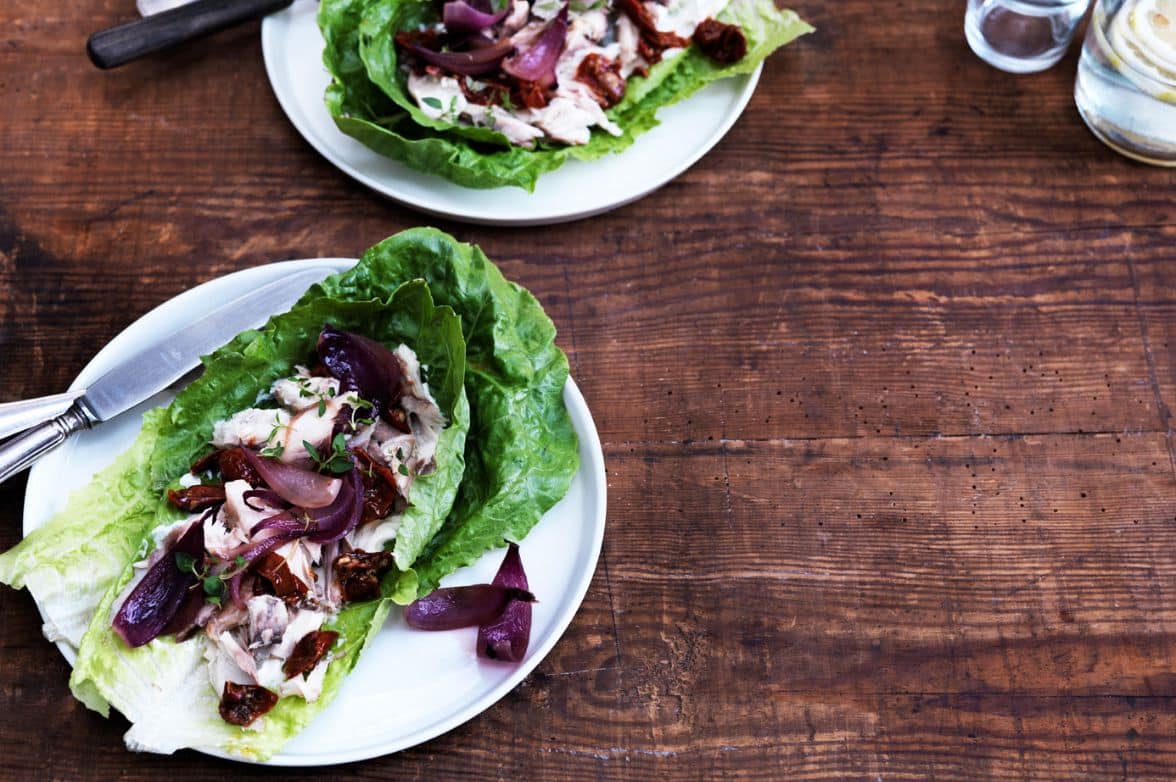 - Fordel romainesalat på to tallerkener og kom lidt mayonnaise på hvert blad.